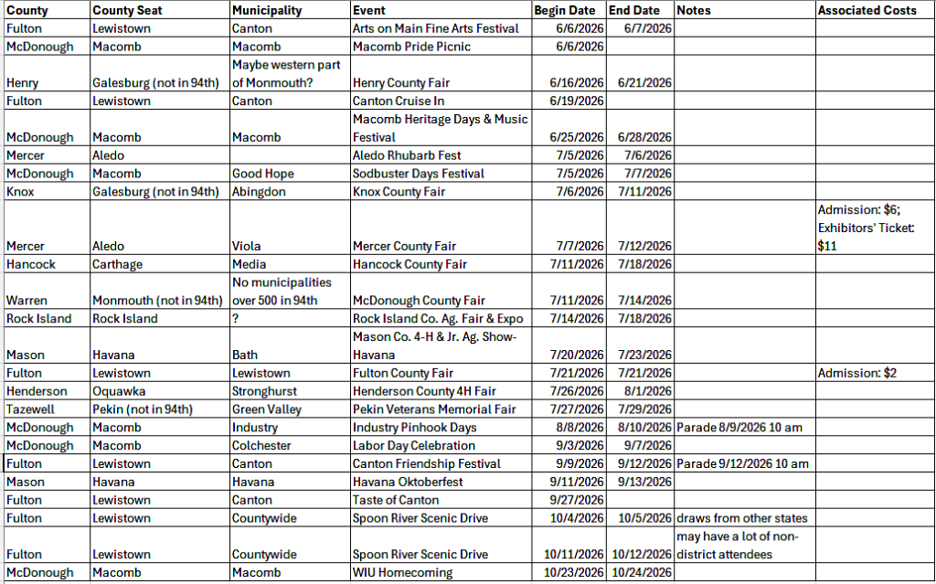 Below is a table of upcoming community events in the 94th. Candidates should review this table and include a statement explaining which/how many of these events they realistically expect they could attend for campaign purposes, if selected. These statements should be emailed to mail@indivisibleWCIL.org by April 20th, 2026 to be considered by the committee.
